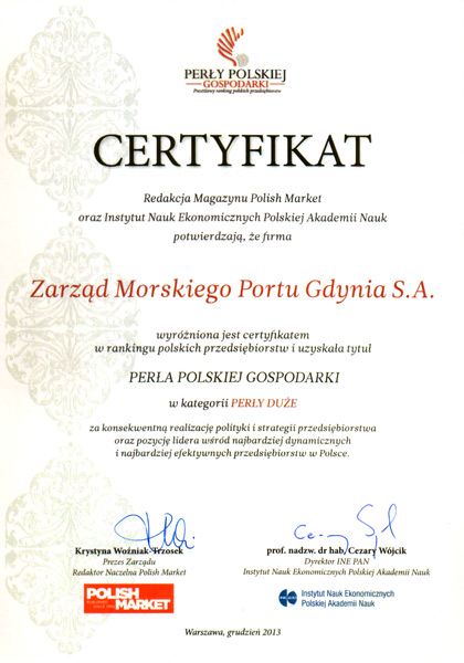 3 grudnia 2013 r. na Zamku Królewskim w Warszawie odbyła się XI Gala Pereł Polskiej Gospodarki, podczas której ogłoszono wyniki rankingu „Perły Polskiej Gospodarki”. Zarząd Morskiego Portu Gdynia S.A. znalazł się na 51. miejscu w kategorii Duże Perły.