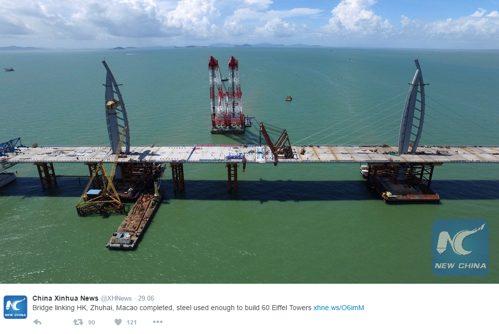 Most Hongkong-Zhuhai-Makau to najdłuższe połączenie zrealizowane dotychczas na otwartym morzu. Jak informuje portal, do eksploatacji wejdzie pod koniec 2017 roku. Inwestycja obejmuje także 6,7-kilometrowy odcinek tunelu podmorskiego. W sumie 55-kilometrowa przeprawa połączy Hongkong z Makau i skróci czas podróży z 4 godzin do około 30 minut.