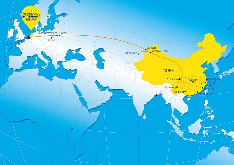 Port w Rotterdamie ogłosił, że pierwsze stałe połączenie kolejowe pomiędzy Chinami i Holandią, na trasie Chengdu-Rotterdam, zostało uruchomione. Czas przejazdu pomiędzy terminalami ma zamykać się w ciągu 15 dni.