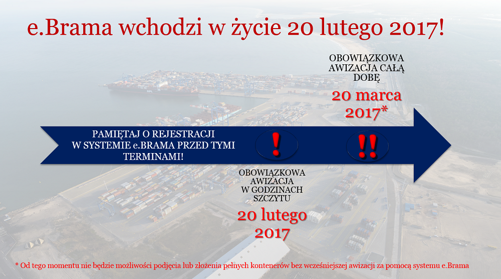 Od tego momentu system awizacji e.BRAMA to jedyny sposób, aby odebrać lub złożyć pełny kontener w DCT Gdańsk. Wcześniejsza awizacja samochodów ciężarowych obowiązywać będzie całą dobę wszystkich kierowców przyjeżdzających do DCT Gdańsk.