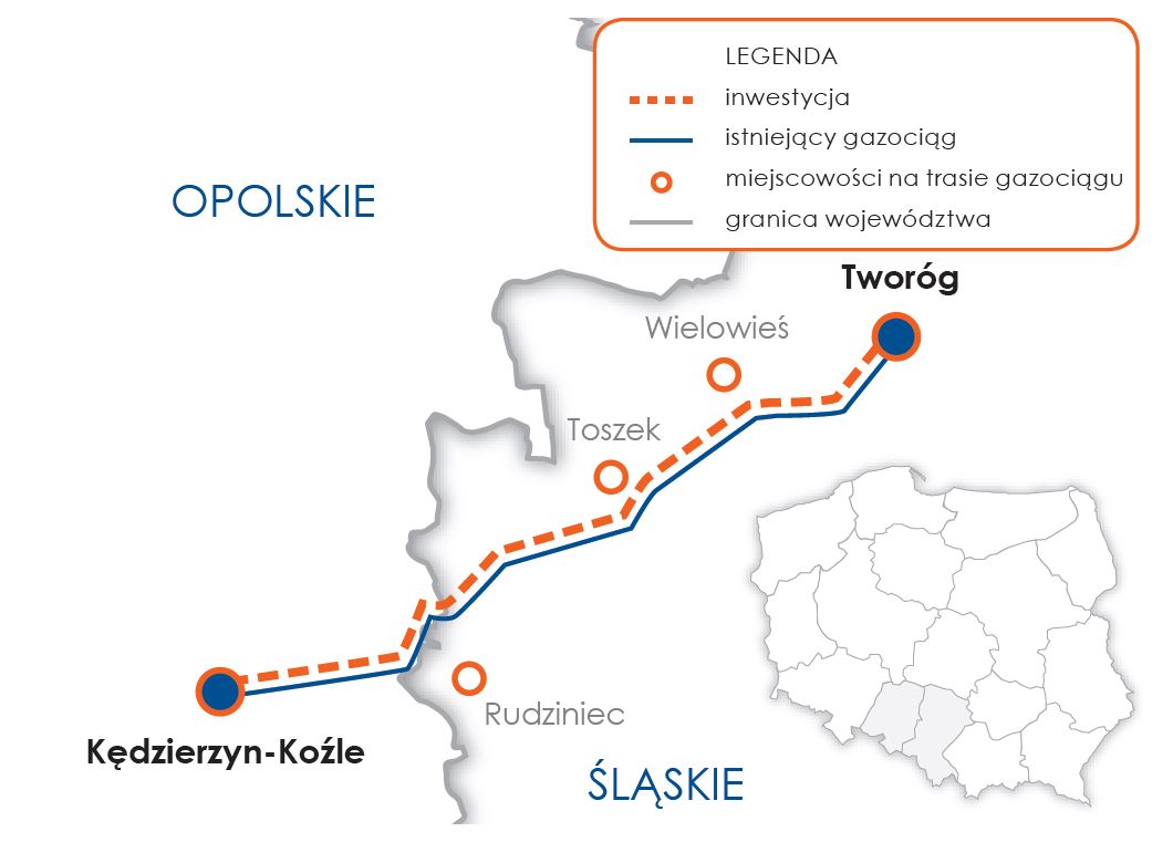 Gazociąg o długości 43,4 km i średnicy 1 metra zostanie wybudowany na terenie województwa śląskiego i opolskiego w gminach Tworóg, Wielowieś, Toszek, Rudziniec i Kędzierzyn-Koźle. Nowy gazociąg zostanie połączony z planowanymi do budowy gazociągami: Tworóg – Tworzeń oraz Zdzieszowice – Kędzierzyn-Koźle.
