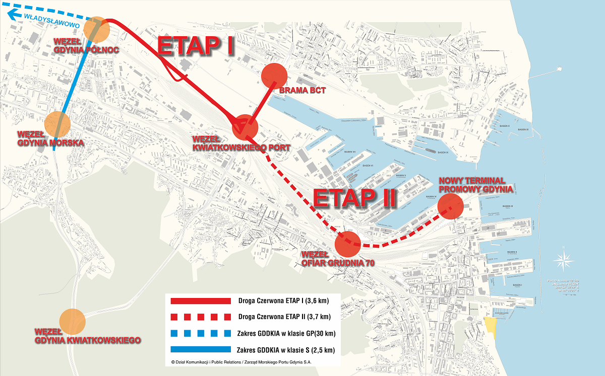 Projekt jej budowy podzielony jest na dwa etapy. Pierwszy obejmuje ok. 3,5-kilometrowy odcinek od węzła Gdynia Północ (w rejonie ul. Puckiej) do Bałtyckiego Terminalu Kontenerowego. Drugi natomiast ma być przedłużeniem tego odcinka o kolejne 3,5 km do ronda Karlskrona, gdzie powstaje nowy terminal promowy. Szacunkowe koszty budowy Drogi Czerwonej to obecnie około 700-800 mln zł.