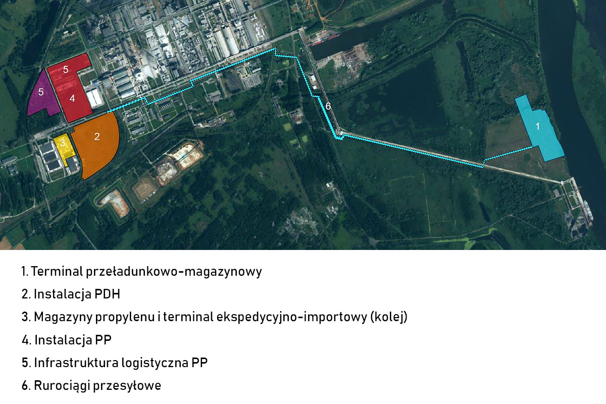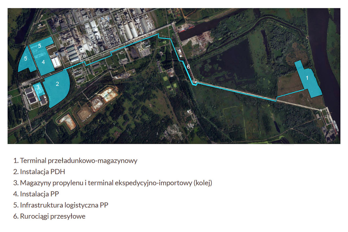 Obiekty portowe pozwolą na:- rozładunek surowców,- magazynowanie 60.000 m³ propanu w zbiornikach kriogenicznych 2 × 30 000 m³ oraz 12 000 m³ etylenu w zbiorniku kriogenicznym (pojemność magazynowa netto),- dystrybucję propanu i etylenu do instalacji produkcyjnej PDH/PP.
