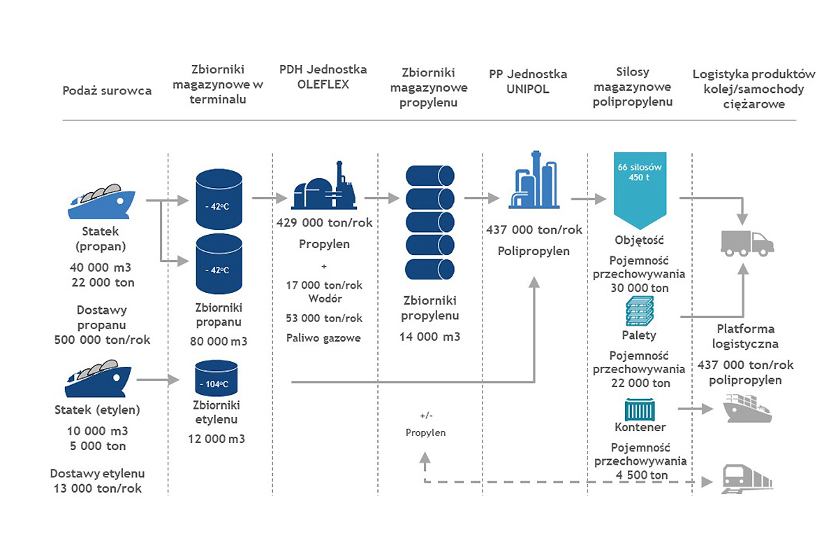 Docelowa planowana wydajność Instalacji PDH ma wynosić 429 tys. ton/rok propylenu o czystości 99,6 % obj. (propylen klasy polimerowej), a Instalacji PP - 437 tys. ton/rok polipropylenu.