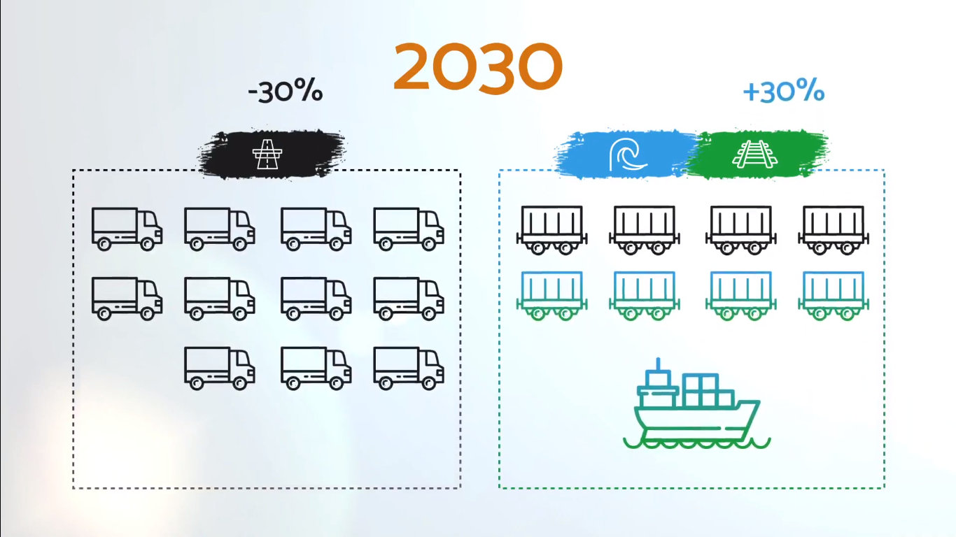 Jednym ze sposobów przeciwdziałania temu zagrożeniu jest przeniesienie części transportu z kołowego na bardziej ekologiczne gałęzie transportu, w tym kolej i drogi wodne. Koncepcja ta jest w pełni zgodna z celami strategii transportowej Unii Europejskiej, aby do 2030 roku 30 procent transportu towarowego przenieść na kolej i drogi wodne.