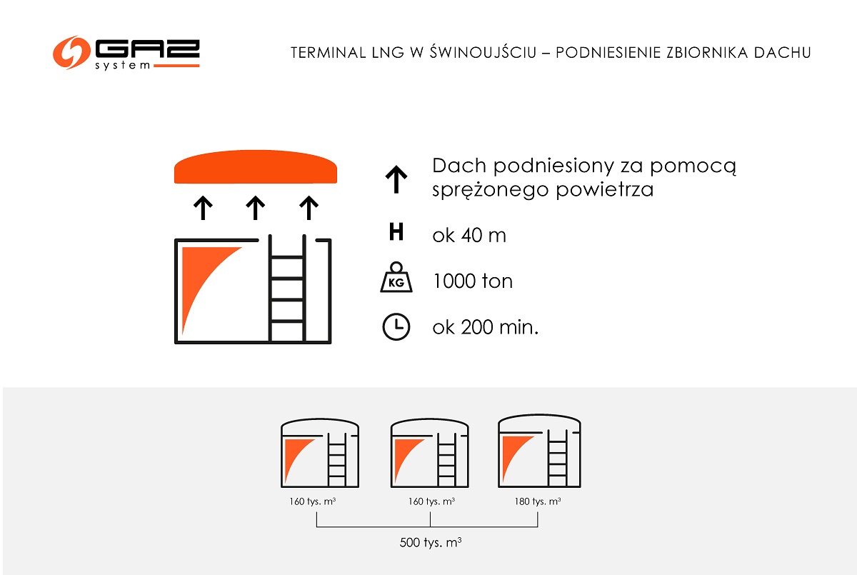 GAZ-SYSTEM zrealizował kolejny ważny etap rozbudowy Terminalu LNG im. Prezydenta Lecha Kaczyńskiego w Świnoujściu – betonowe ściany budowanego trzeciego zbiornika LNG na Terminalu zostały przykryte stalowym dachem ważącym ponad 1000 ton.