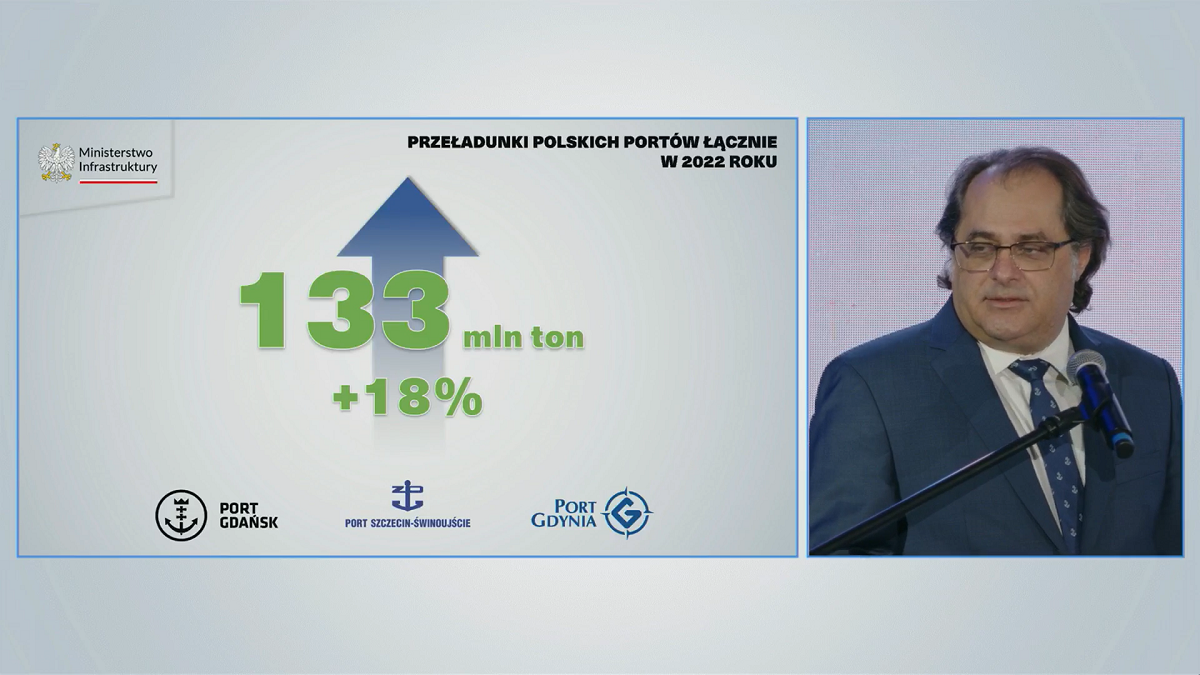 Wiceminister podkreślił, że 2022 r. mimo sytuacji geopolitycznej był kolejnym rekordowym dla polskich portów morskich w: Gdańsku, Gdyni oraz portów Szczecin i Świnoujście.