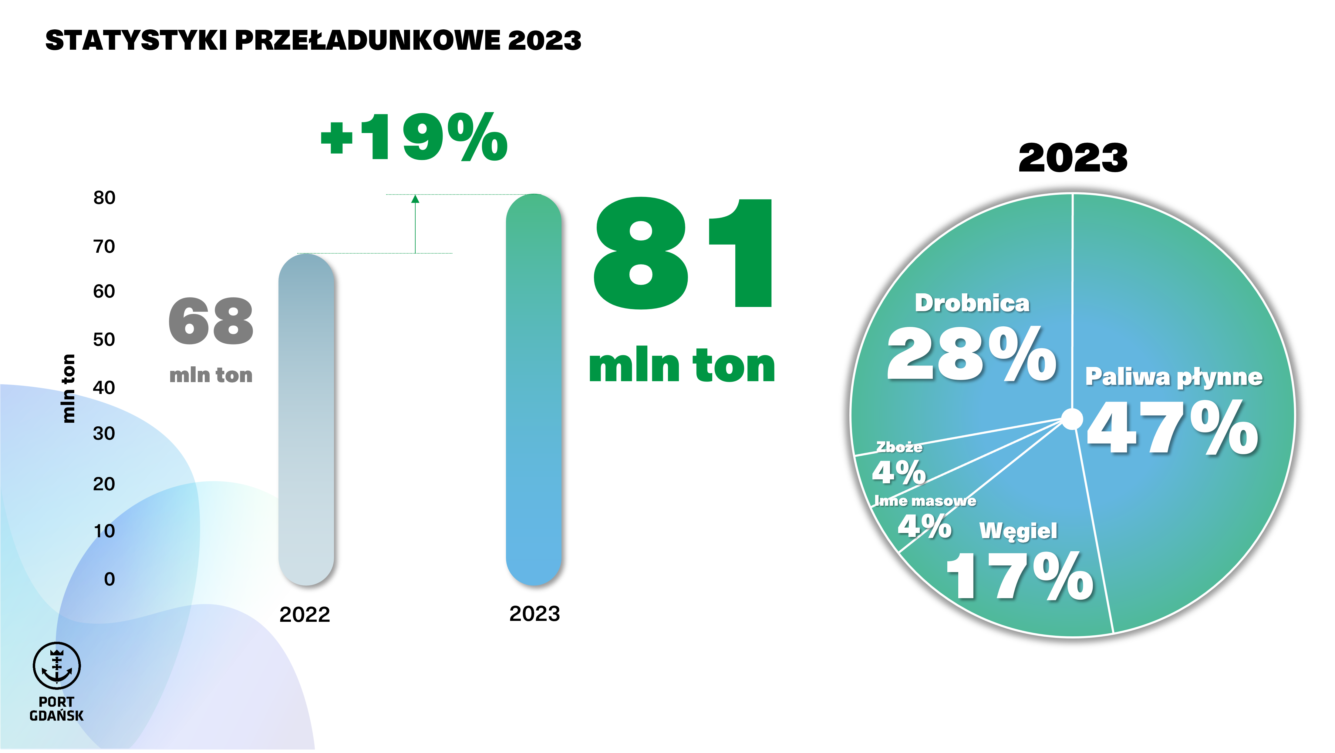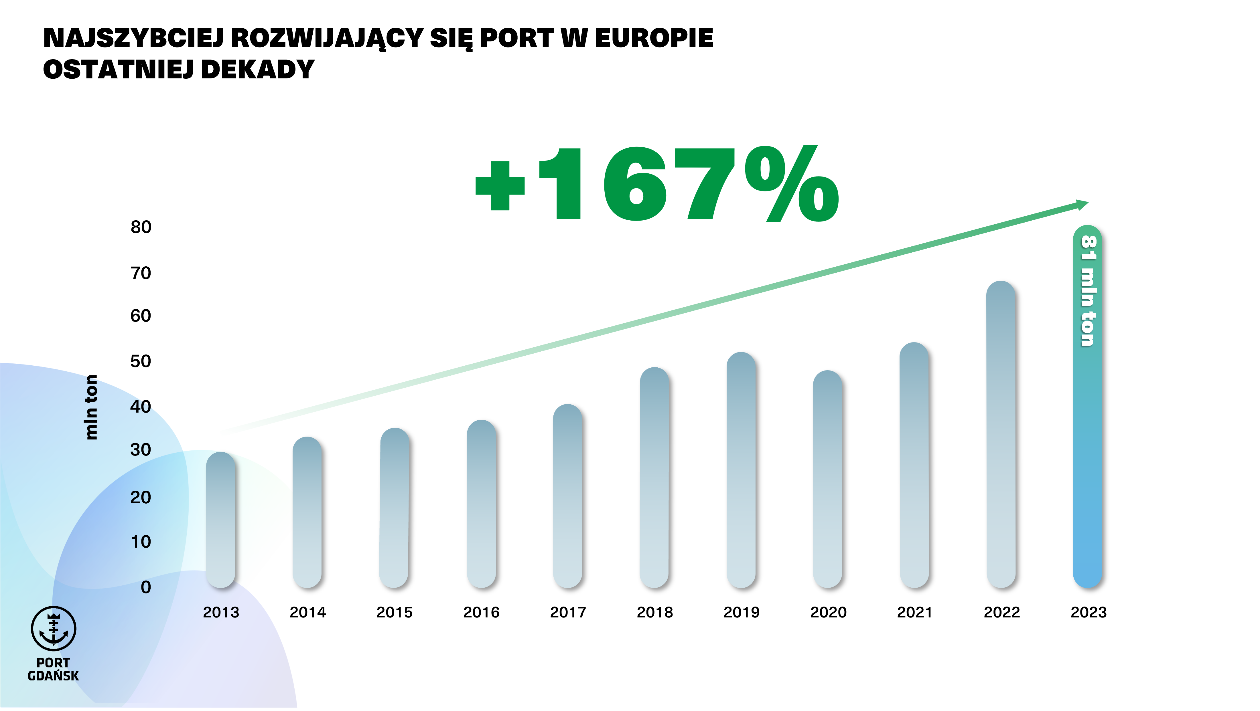 Dynamiczny rozwój Portu Gdańsk i sukcesywny wzrost przeładunków można obserwować od kilku lat. Jednak w ostatnim roku, z uwagi na sytuację geopolityczną, nastąpił olbrzymi skok. Największy polski port przekroczył kolejną barierę przeładunków. Blisko 81 mln ton, oznacza wzrost o ponad 12,7 mln ton w porównaniu do 2022 r.