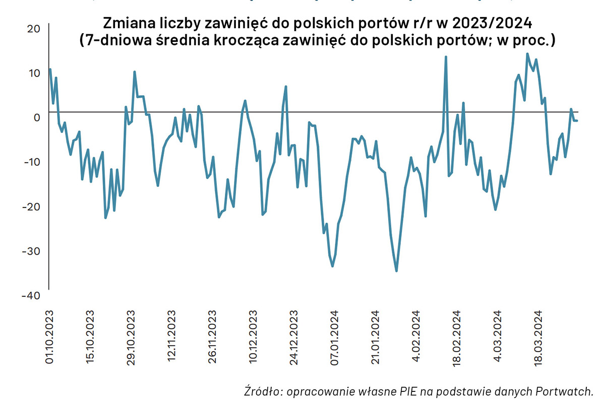Według PIE spowolnienie gospodarcze wpłynęło na polski import w 2023 r.; w porównaniu z 2022 r. jego wartość spadła o 9,1 proc. r/r, jednak wolumen zmniejszył się tylko o 0,9 proc. W styczniu 2024 r. trend spadkowy w imporcie był nadal widoczny - jego wartość spadła o 14,6 proc. r/r. Wpływ spowolnienia widać również w polskich danych portowych. W całym 2023 r. liczba zawinięć zmniejszyła się o 2,2 proc. r/r - według platformy PortWatch.