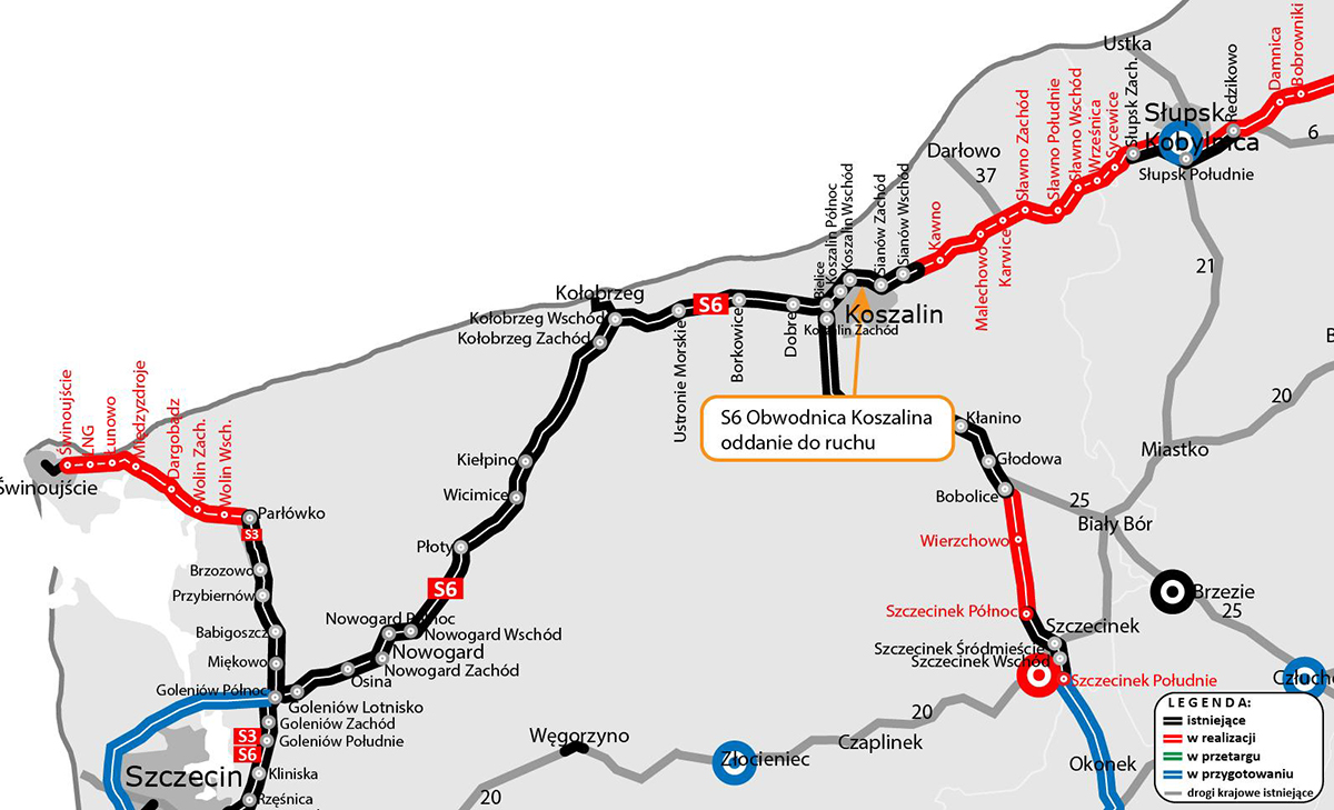 W sobotę po godz. 8 w obecności m.in. wiceministra infrastruktury Arkadiusza Marchewki oddany został do ruchu brakujący fragment obwodnicy od węzła Koszalin Wschód do węzła Sianów Zachód. To odcinek o długości 4,6 km w ciągu drogi ekspresowej S6.