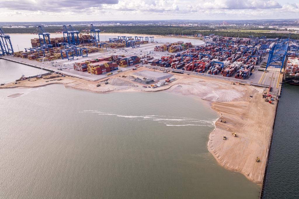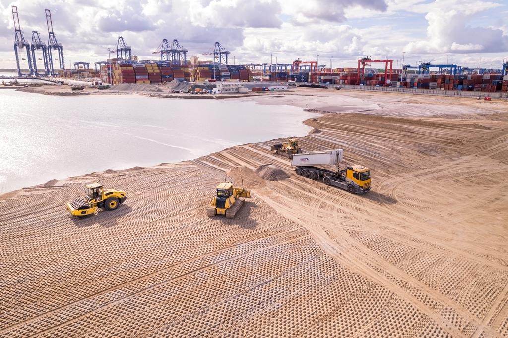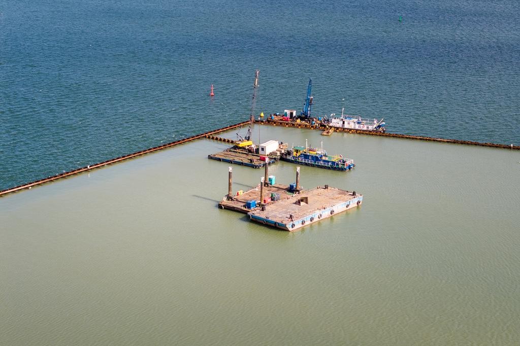 - Terminal T5 rośnie w oczach, intensyfikujemy roboty na każdym froncie. Przywozimy dziennie 30 tys. m³ piasku zarówno ze źródeł lądowych, jak i morskich. Wykonaliśmy już montaż wszystkich instalacji dla wszystkich kotew klapowych na nabrzeżu outbound i kontynuujemy je na nabrzeżu inbound. Jeśli chodzi o roboty kafarowe, zostawiliśmy jedynie przerwę w ścianie wschodniej - jest to przerwa technologiczna, pozwalająca wpuszczać jednostki pogłębiarki, które zasypują terminal od strony wody – mówi Łukasz Jagalski, Zastępca Kierownika Budowy z Grupy NDI.
