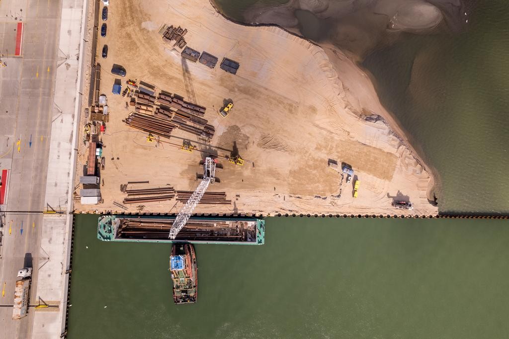 Na terenie budowy powstało też nabrzeże temporary, a więc nabrzeże tymczasowe, gdzie odbywają się roboty związane ze składaniem kotew klapowych i ich transportem na plac budowy. Na nabrzeżu outbound została przygotowana platforma robocza pod wykonanie pali CFA (pale wiercone, formowane w gruncie), która wynosi ponad 160 metrów.