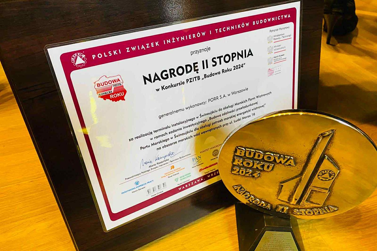 Firma PORR S.A., wykonawca inwestycji Zarządu Morskich Portów Szczecin i Świnoujście S.A. – terminalu instalacyjnego dla morskich farm wiatrowych w Świnoujściu, została uhonorowana Nagrodą II stopnia w Konkursie Polskiego Związku Inżynierów i Techników Budownictwa „Budowa Roku 2024” oraz Złotą Kotwicą BALTEXPO w kategorii Infrastruktura. To wyjątkowe wyróżnienia, podkreślają przedstawiciele ZMPSiŚ.