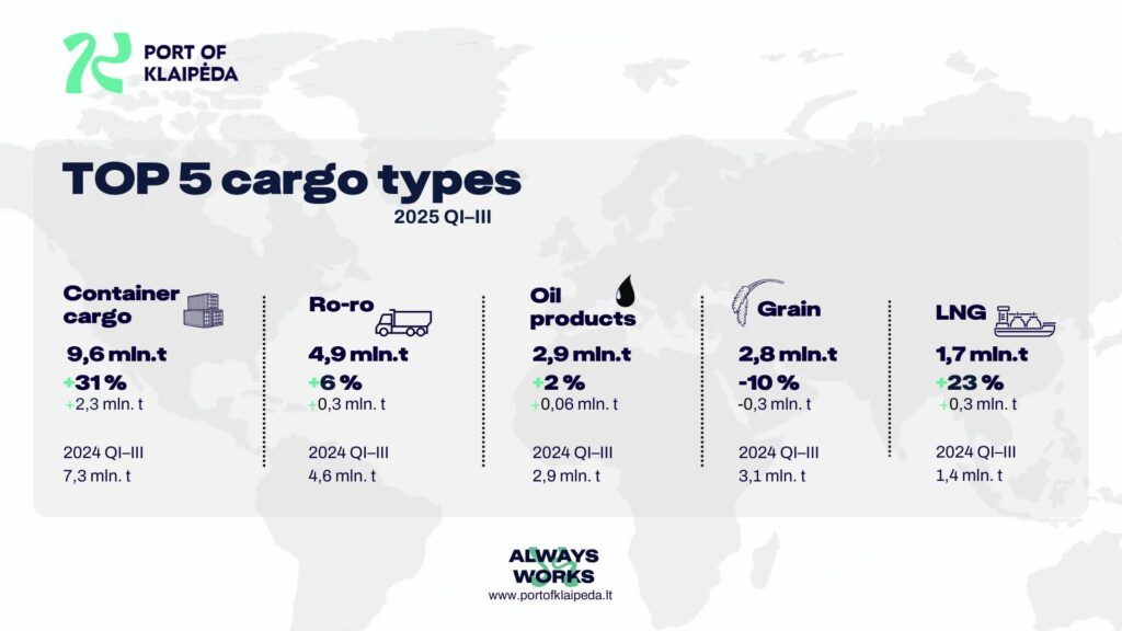 Obsługa skroplonego gazu ziemnego (LNG) i materiałów budowlanych wzrosła o 23 proc. w ciągu pierwszych dziewięciu miesięcy, osiągając około 1,7 mln ton. FSRU Independence nadal odgrywa coraz ważniejszą rolę w porcie w Kłajpedzie, co wynika z sytuacji geopolitycznej i decyzji Litwy o zaprzestaniu importu gazu z Rosji. Wzrost w segmencie materiałów budowlanych jest związany z aktywnymi projektami drogowymi i kolejowymi na Litwie. W segmencie ro-ro (roll-on/roll-off) wolumen ładunków wzrósł o 6 proc., osiągając prawie 5 mln ton, natomiast przeładunek produktów naftowych wzrósł o 2 proc. do prawie 3 mln ton. Na segmenty te wpływają trendy na rynku światowym, czynniki geopolityczne oraz polityka transformacji ekologicznej, informuje zarząd portu.