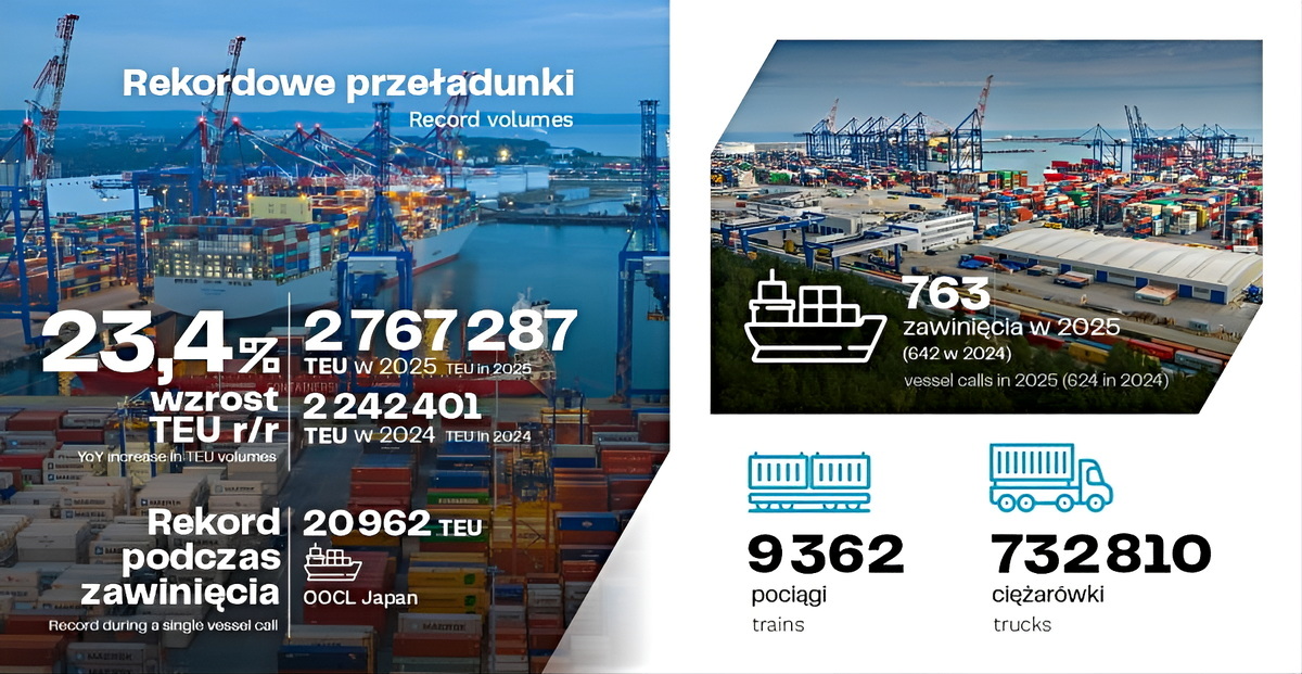 "Rośnie znaczenie przeładunków kolejowych – tylko w 2025 r. terminal obsłużył 9 362 pociągów (ponad 1100 więcej w stosunku do roku 2024), a wśród kluczowych działań na nadchodzący rok znajduje się m.in. dalszy rozwój systemu kolejowego. Przewidziany jest również rozwój kompleksu bramowego, który zwiększy przepustowość terminala i usprawni obsługę partnerów biznesowych” – wskazano.