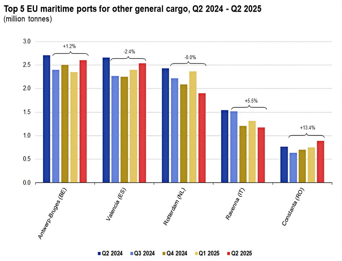 W kategorii pozostałej drobnicy liderem była Antwerpia–Bruggia, wyprzedzając Walencję, Rotterdam, Rawennę i Konstancę. Największy wzrost rok do roku odnotowała Konstanca (+16,0%), podczas gdy Rawenna (-24,0%) i Rotterdam (-22,0%) zanotowały znaczące spadki. W ujęciu rocznym Konstanca i Rawenna poprawiły wyniki, a Rotterdam utrzymał stabilny poziom.