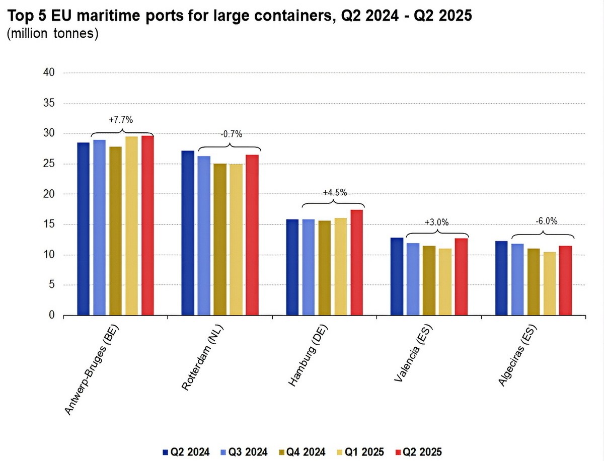 W segmencie ładunków kontenerowych (w tonach) liderem pozostała Antwerpia–Bruggia, przed Rotterdamem, Hamburgiem, Walencją i Algeciras. Najlepszą dynamikę wzrostu rok do roku odnotował Hamburg (+9,5%), a także Antwerpia–Bruggia (+4,0%). Spadki zanotowały Algeciras (-5,9%), Rotterdam (-2,6%) i Walencja (-0,3%).