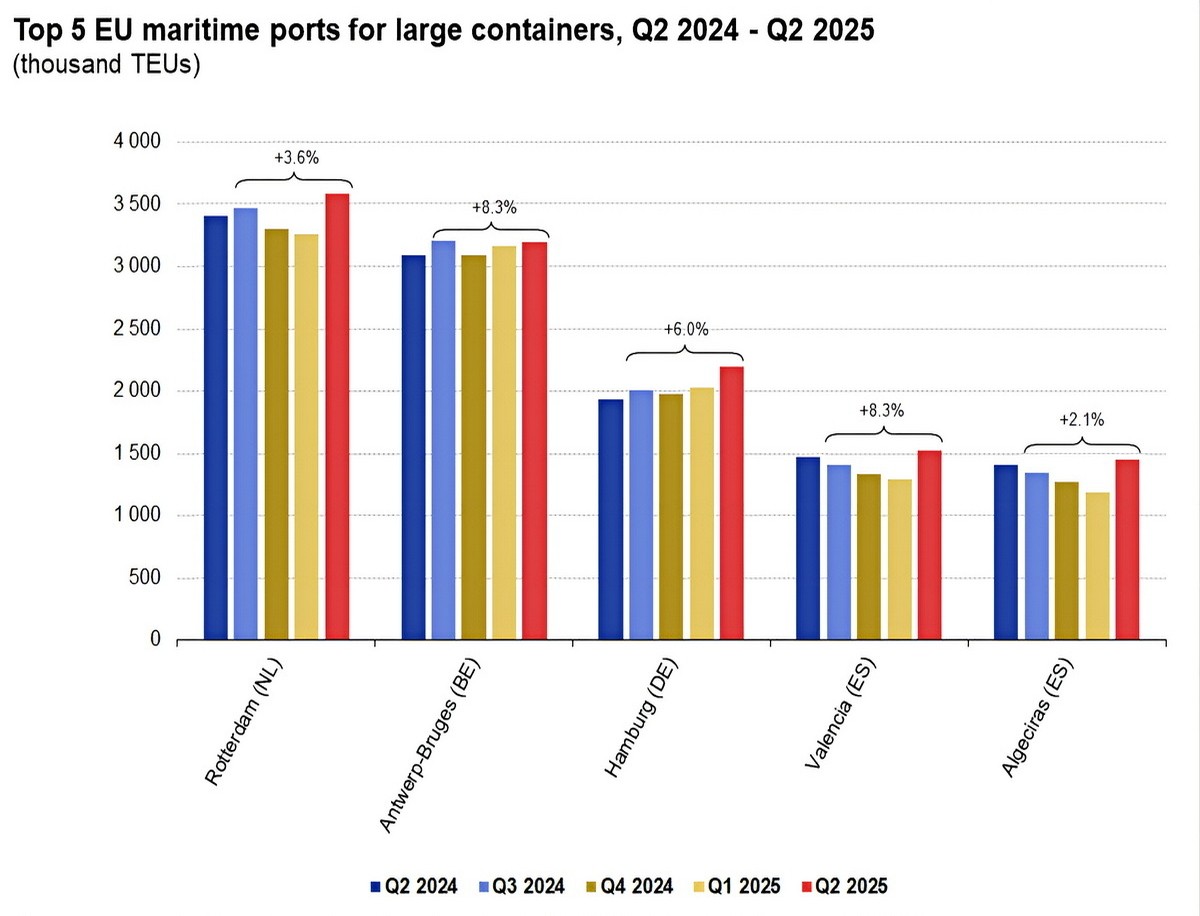 Jednocześnie ranking oparty na liczbie TEU (kontenerów dwudziesto-stopowych) wyglądał inaczej – Rotterdam wyprzedził Antwerpię–Bruggię. Wszystkie porty z pierwszej piątki zwiększyły liczbę obsłużonych kontenerów, a największy wzrost odnotował Hamburg (+13,9%), przed Rotterdamem (+5,3%) i Walencją (+4,0%).