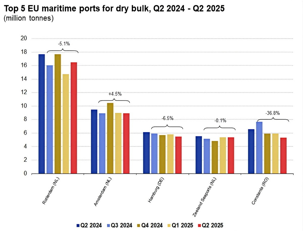 W przypadku ładunków masowych suchych wszystkie pięć czołowych portów (Rotterdam, Amsterdam, Hamburg, Zeeland Seaports i Konstanca) zanotowało spadki rok do roku. Najsilniej ucierpiała Konstanca (-18,5%), przed Hamburgiem (-10,8%) i Rotterdamem (-6,7%).