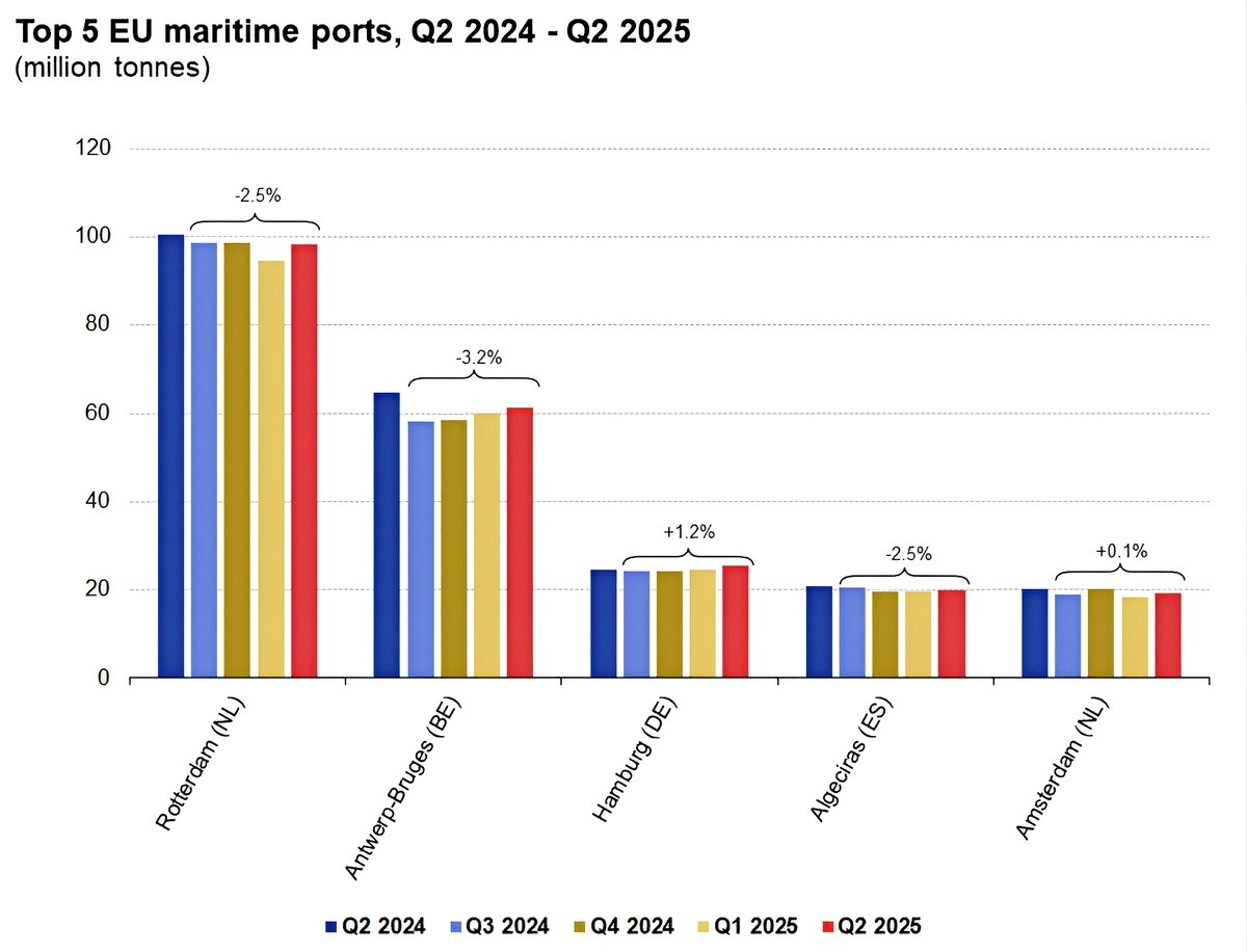 W ujęciu rok do roku wzrost odnotował jedynie Hamburg (+3,5%), podczas gdy pozostałe porty z pierwszej piątki zanotowały spadki: Antwerpia–Brugia (-5,2%), Amsterdam (-4,2%), Algeciras (-3,7%) oraz Rotterdam (-2,0%). W ujęciu rocznym Hamburg (+1,2%) i Amsterdam (+0,1%) wykazały niewielki wzrost, natomiast trzy pozostałe porty zanotowały spadki.