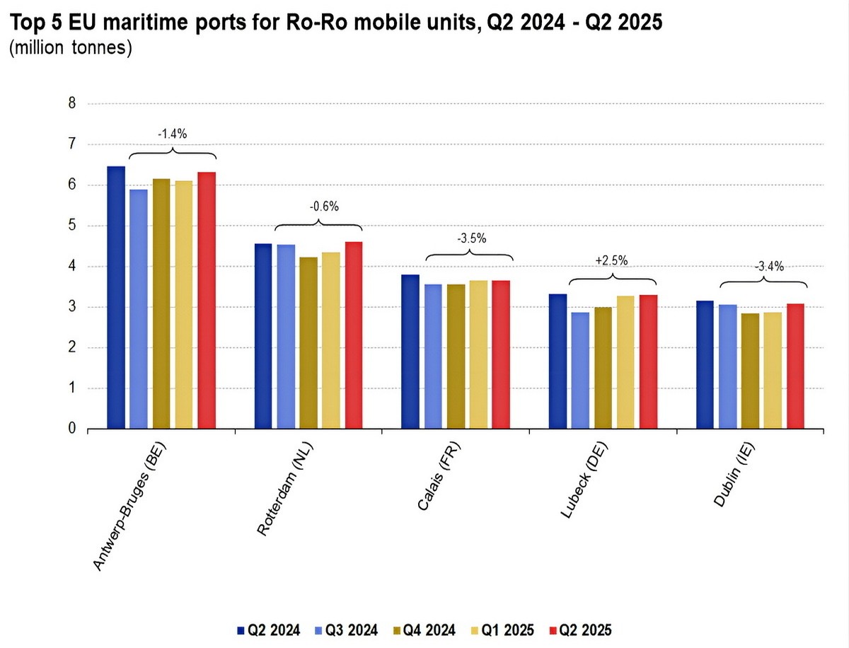 W segmencie ładunków tocznych największym portem UE była Antwerpia–Bruggia, przed Rotterdamem, Calais, Lubeką i Dublinem. W II kwartale 2025 roku cztery z pięciu portów zanotowały spadki rok do roku, a w ujęciu rocznym jedynie Lubeka osiągnęła wzrost (+2,5%).