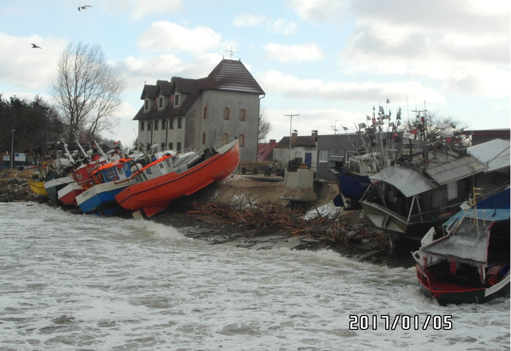 Zniszczone są umocnienia brzegowe w Dziwnowie oraz przystań rybacka w Międzyzdrojach. Na Westerplatte górna część umocnienia brzegu wymaga naprawy, podobnie umocnienia brzegu na Helu. Prace już tu trwają. W Jastrzębiej Górze nie można jeszcze wejść na opaskę brzegową w celu oceny jej stanu technicznego. Tu też obniżyły się plaże, zniszczone są zejścia.