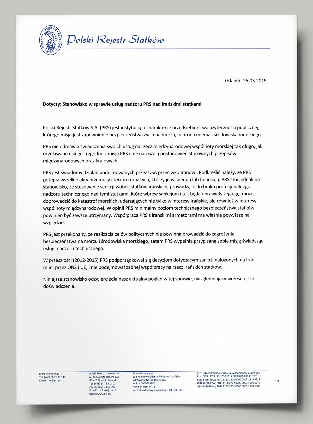 "Naszym zdaniem minimalny poziom bezpieczeństwa technicznego musi być zapewniony w każdym przypadku. Współpraca PRS z irańskimi właścicielami ma taki charakter".