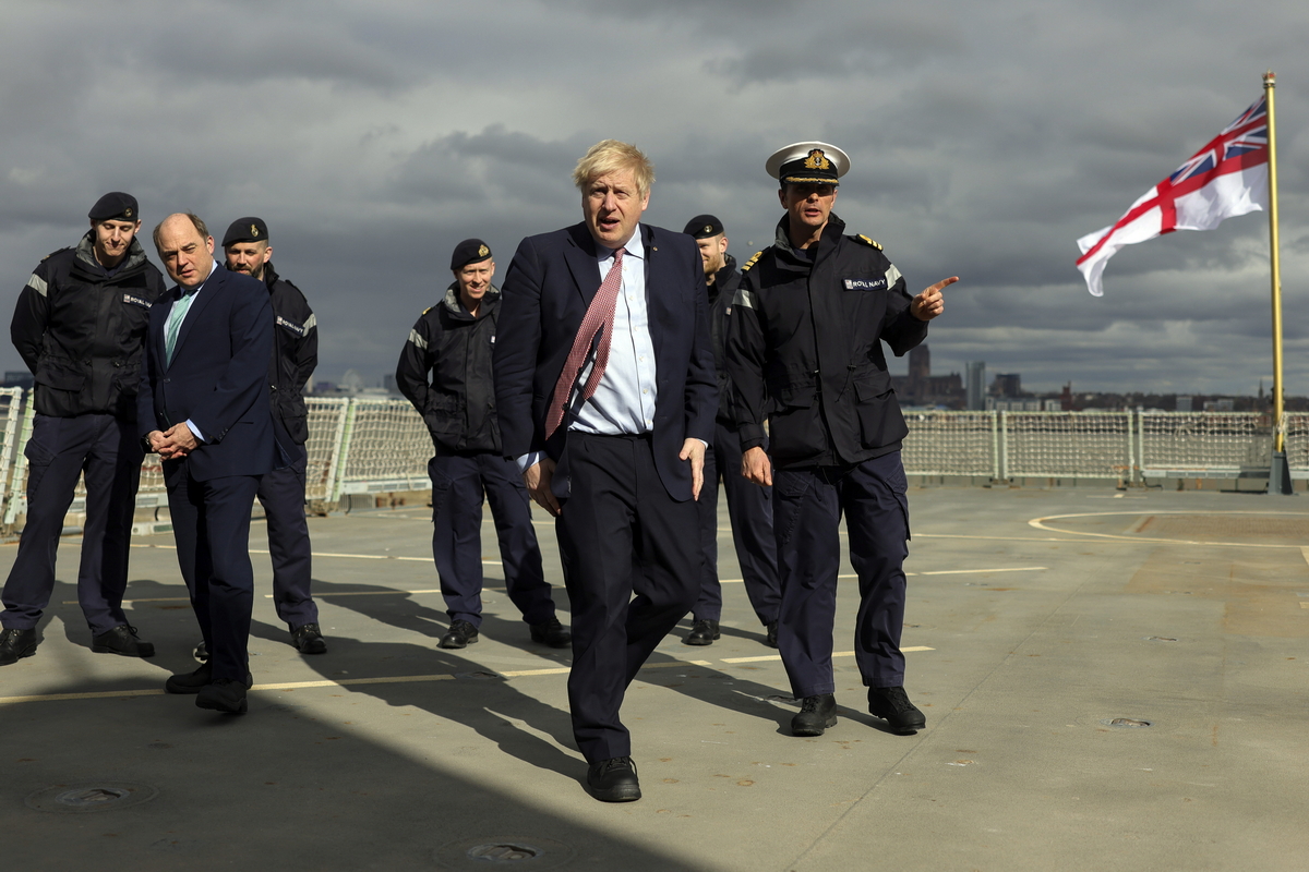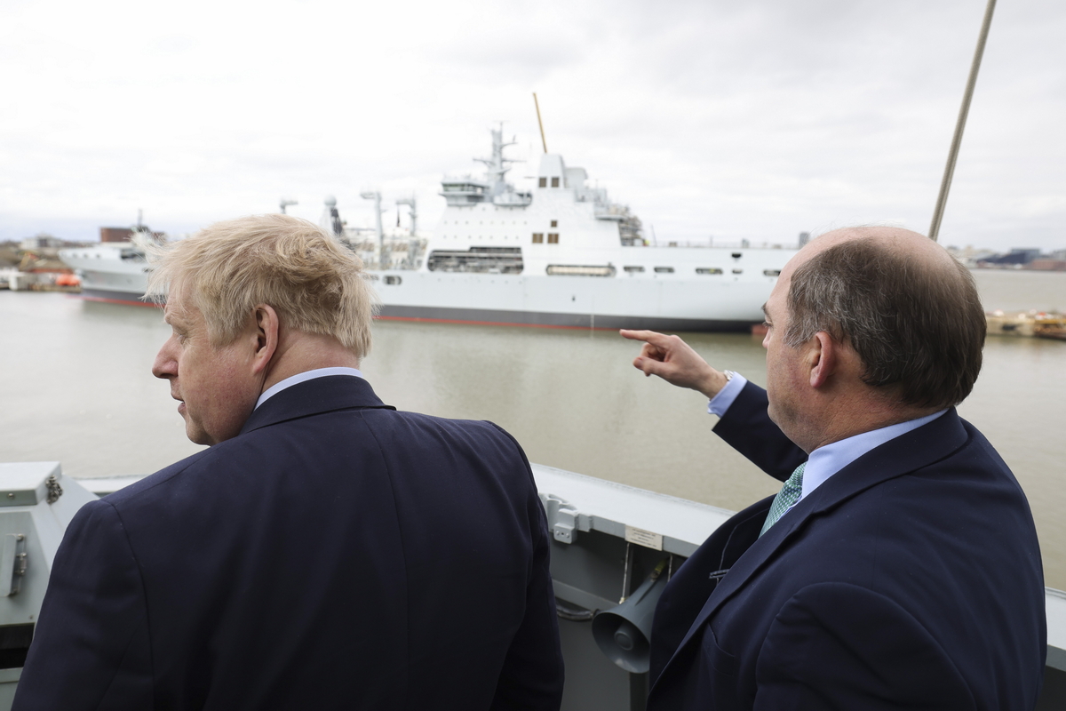 Poniżej: Premier Boris Johnson i sekretarz obrony Ben Wallace odwiedzili stocznię Cammell Laird i weszli na pokład okrętu HMS Dauntless. Zdjęcia: Andrew Parsons / No 10 Downing Street /Licencja Open Government Licence v3.0., Grafika: Piotr B. Stareńczak/PORTALMORSKI.PL