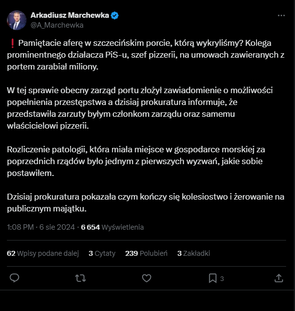 Pamiętacie aferę w szczecińskim porcie, którą wykryliśmy? Kolega prominentnego działacza PiS-u, szef pizzerii, na umowach zawieranych z portem zarabiał miliony. W tej sprawie obecny zarząd portu złożył zawiadomienie o możliwości popełnienia przestępstwa a dzisiaj prokuratura informuje, że przedstawiła zarzuty byłym członkom zarządu oraz samemu właścicielowi pizzerii – napisał dzisiaj w mediach społecznościowych Arkadiusz Marchewka.