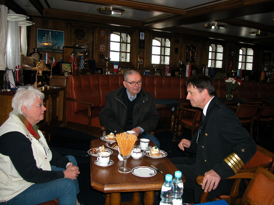 Kapitana Olechnowicza z małżonką, podejmował na pokładzie były podkomendny jeszcze z czasów praktyk morskich na Darze Pomorza, obecny komendant Daru Młodzieży, kpt.ż.w. Rafał Szymański.