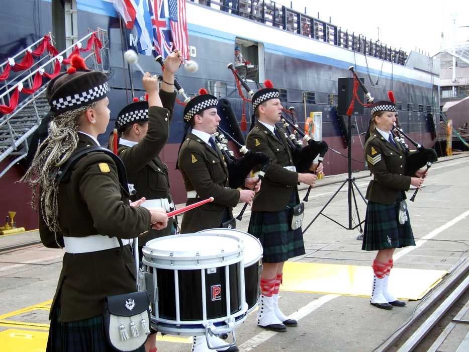 Po odegraniu hymnów – „God save The Queen” i polskiego, matki chrzestne, najpierw Elizabeth Warren, następnie Suzanne Fowlie wygłosiły formułę: “Sail the seas and oceans, glorify the good name of Polish shipbuilders and bless all who sail in her. I name this ship…”, po czym, kolejno o burty obu statków rozbito tradycyjne butelki szampana. Po chrzcie goście weszli na pokład statku Highland Defender.