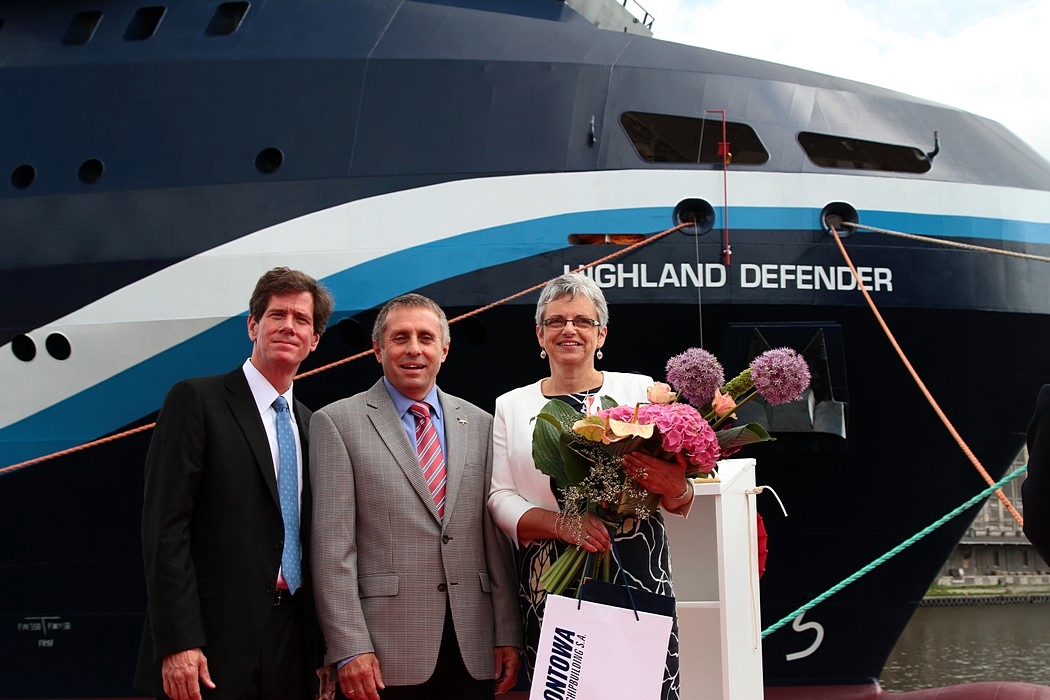 Matką chrzestną statku Highland Defender jest Elizabeth Warren, zaś drugiego - Highland Chieftain - Suzanne Fowlie. Na uroczystość przybyła, obok przedstawicieli stoczni Remontowa Shipbuilding, także liczna delegacja ze strony armatora – firmy GulfMark Offshore.
