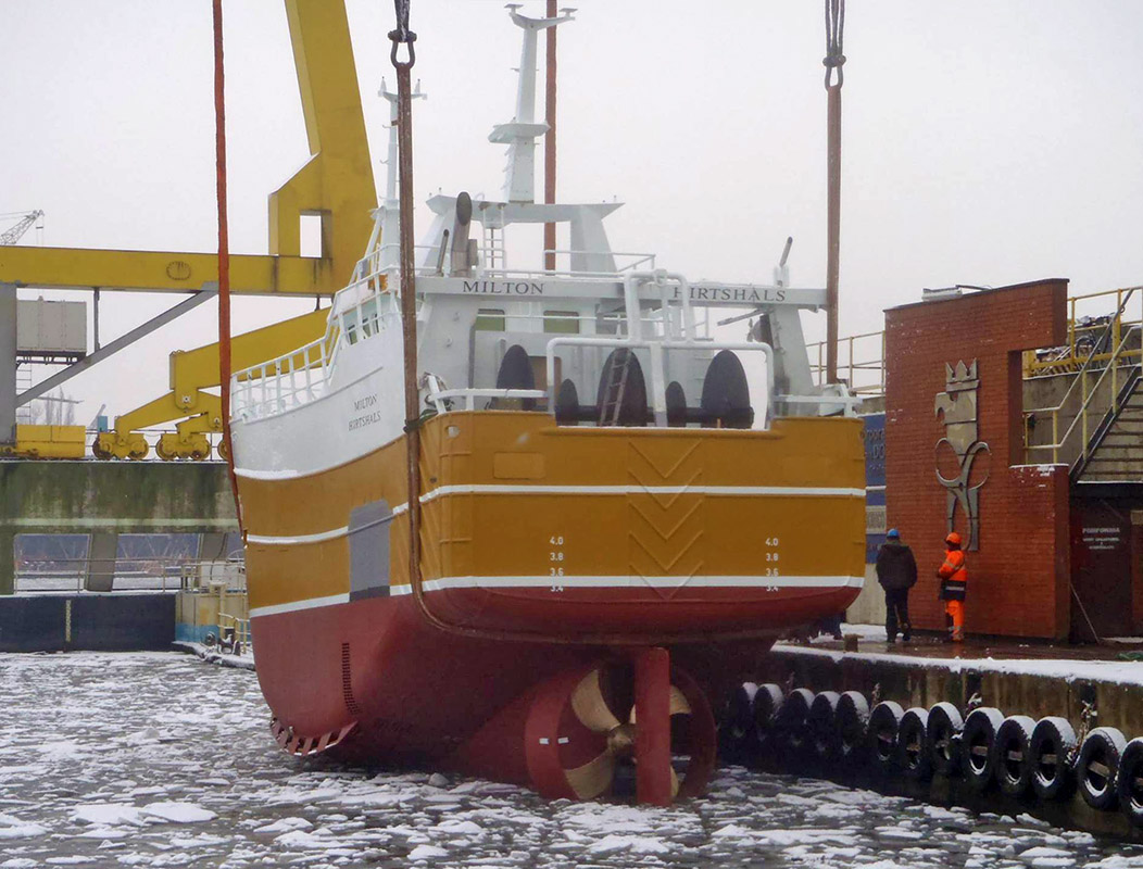 W duńskiej stoczni w Hirtshals trwają prace wykończeniowe i wyposażeniowe na częściowo wyposażonym kadłubie, który dotarł do niej 5 lutego ze Szczecina, przyholowany przez 22,5-metrowy holownik Egesund.