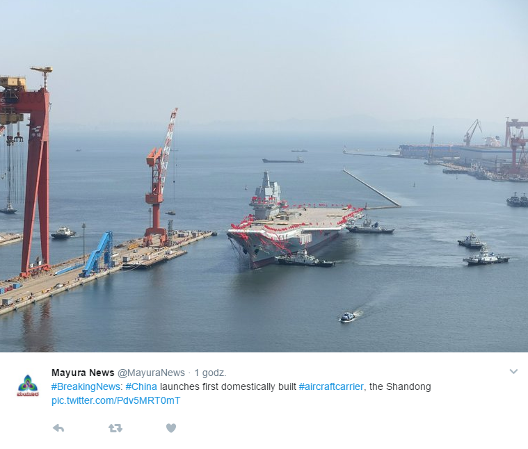#BreakingNews: #China launches first domestically built #aircraftcarrier, the Shandong; With this, PLA Navy now owns two aircraft carriers pic.twitter.com/5RAOntBzwt