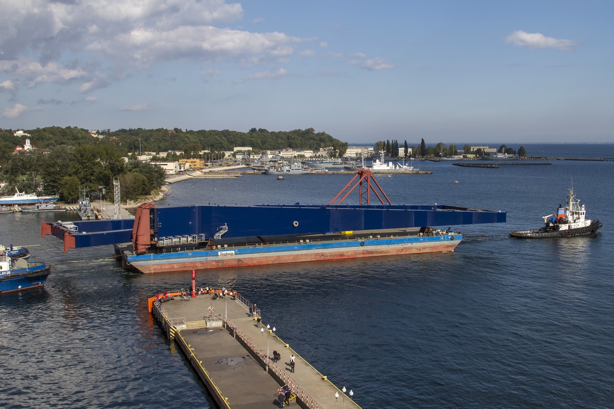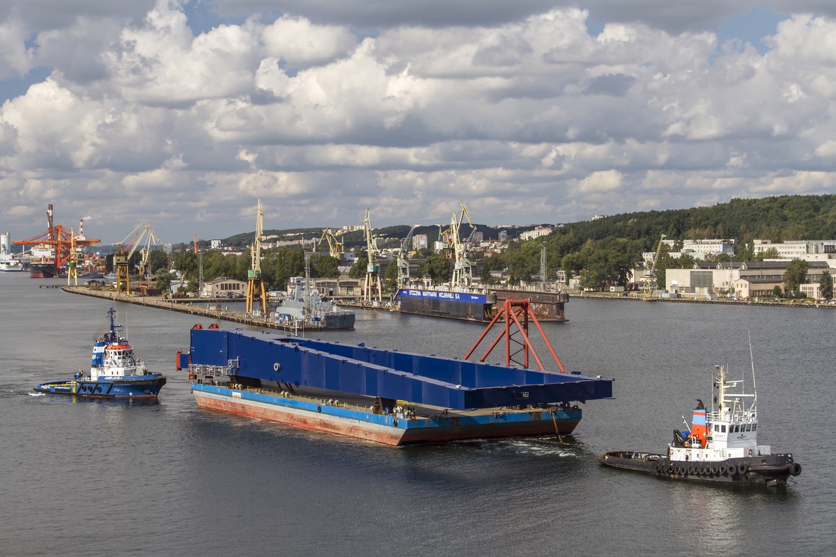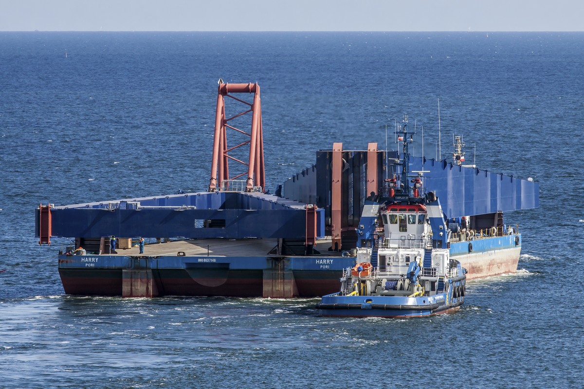 Dwie ramowe podpory zostały przesunięte z nabrzeża Węgierskiego (przy którym pracuje Vistal Stocznia Remontowa) na barko-ponton heavy-lift o imieniu Harry (GT 4886, nośność 11 260 ton).