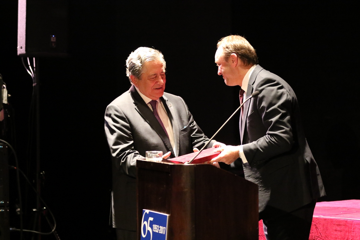 Piotr Soyka wręczył jubileuszową nagrodę specjalną - szklany prostopadłościan z wygrawerowanym laserowo w środku wizerunkiem śruby okrętowej.