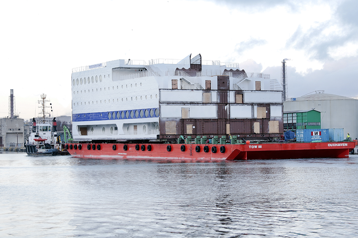 Dwie, 2400-tonowe konstrukcje, po połączeniu, złożą się na nadbudówkę statku budowanego w niemieckiej stoczni Flensburger Schiffbau-Gesellschaft dla operatora promowego Brittany Ferries. Rufową część konstrukcji odholowano z firmy Holm Construction w poniedziałek, 10 grudnia (zestaw holownika z konstrukcją nadbudówki na barko-pontonie spodziewany jest we Flensburgu 13 grudnia), zaś transport dziobowej części nadbudówki, ze stoczni Marine Projects, zaplanowano w weekend 15 lub 16 grudnia.