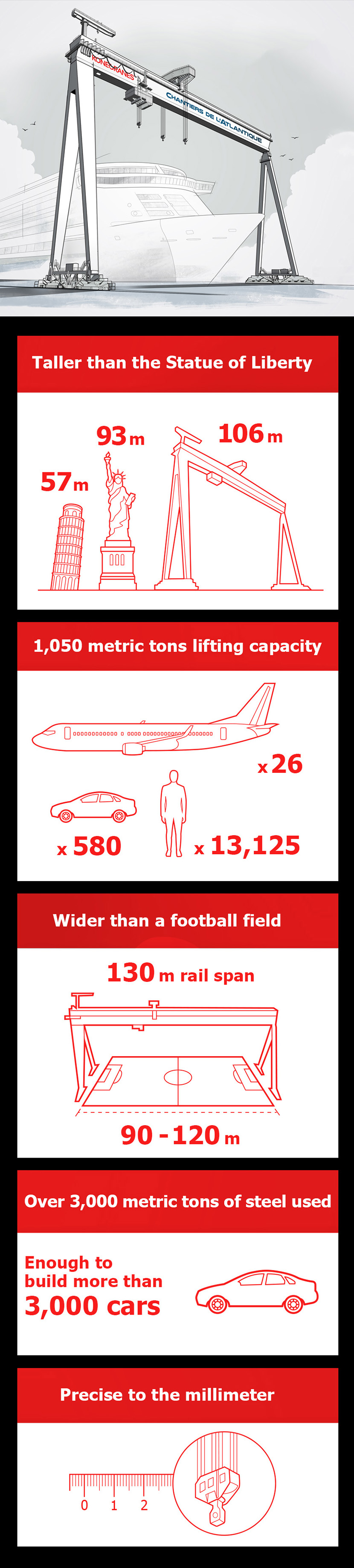 Bertrand Paquet, wiceprezes ds. zakipów w Chantiers de l'Atlantique, powiedział: "To zamówienie złożone w firmie Konecranes jest częścią ambitnego planu inwestycyjnego Chantiers de l'Atlantique". Nowy żuraw typu Goliath, o wysokości o dziesięć metrów wyższej niż w przypadku większej z istniejących suwnic bramowych stoczni, pozwoli nam podnieść i zamontować wszystkie części nadbudówek dużych statków, jakie będziemy budować w najbliższych latach".