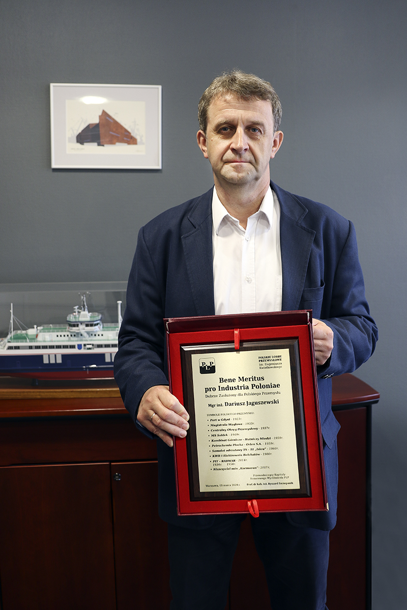 - Wyróżnienie Bene Meritus pro Industria Poloniae zostało przyznane za wkład w rozwój polskiego przemysłu. Zostałem do niego zgłoszony przez Radę Budowy Okrętów. W uzasadnieniu, przedstawionym przez prof. Pawła Sorokę – koordynatora działań Polskiego Lobby Przemysłowego, padały konkretne nazwy projektów, statków, innowacyjnych rozwiązań, którymi zajmowałem się przez ostatnie lata. Dostrzeżony został przede wszystkim okręt ORP Kormoran, uznany przez przedstawicieli Polskiego Lobby Przemysłowego za jedno z najważniejszych osiągnięć polskiego przemysłu na przestrzeni ostatniego stulecia, w jednym rzędzie z budową portu w Gdyni, budową magistrali węglowej czy projektem samolotu odrzutowego TS – 11 „Iskra” - mówi Dariusz Jaguszewski.