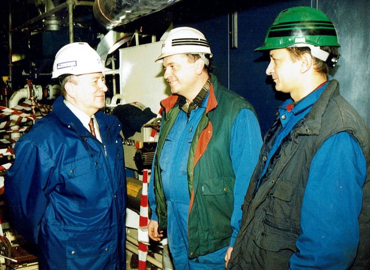 Na zdjęciu poniżej dyrektor naczelny Piotr Soyka w latach 90., podczas jednej z wielu inspekcji na statkach remontowanych w stoczni. Pierwszy z prawej – kierownik Wydziału Rurowni Adam Ruszkowski.
