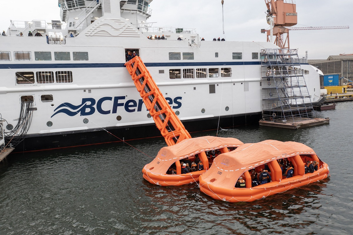 Zgodnie z wewnętrznym harmonogramem prób na promie przeprowadzono także testy systemu MES (Marine Evacuation System), czyli systemu masowej ewakuacji.