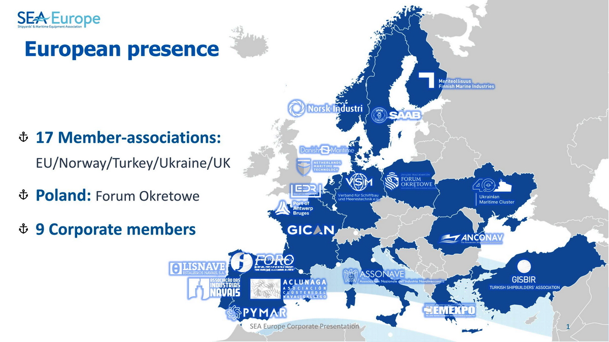 SEA Europe reprezentuje europejski przemysł stoczniowy – komercyjny i wojskowy - oraz producentów wyposażenia okrętowego 17 krajów zrzeszonych w Unii Europejskiej oraz Wielkiej Brytanii, Norwegii, Turcji i Ukrainy. Polski przemysł stoczniowy reprezentowany jest w niej przez Związek Pracodawców FORUM OKRĘTOWE. Kluczowy zagadnieniem jakim obecnie się zajmuje jest stworzenie strategii przemysłowej Unii Europejskiej dla przemysłu stoczniowego i producentów wyposażenia okrętowego, zapewniający tej branży stabilny rozwój.