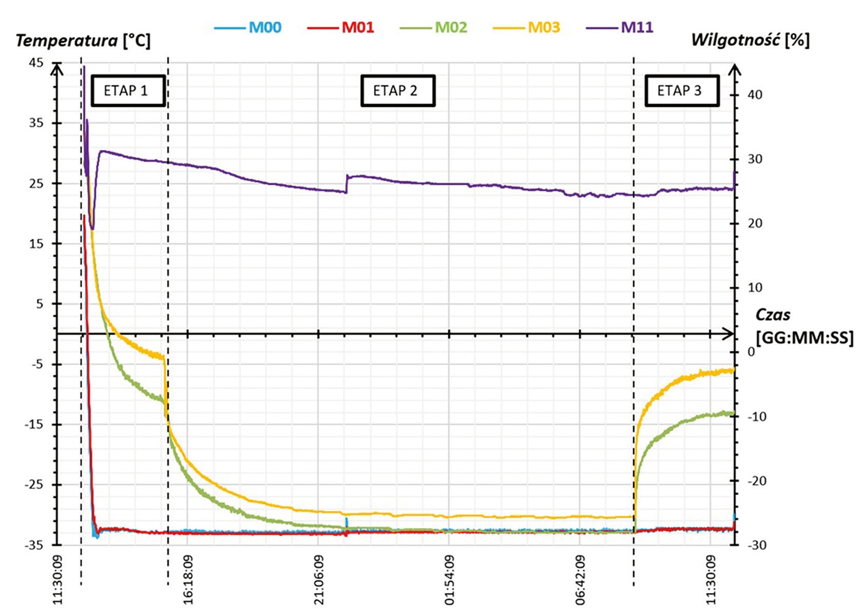 Poniżej przedstawiono poglądowy wykres temperatury z przeprowadzonych badań. Widać na nim, iż osiągnięto we wnętrzu szaf temperatury wyższe niż -15°C, co pozwoliło na pracę dobranych komponentów szafy w zakresie dopuszczalnych temperatur ich pracy.