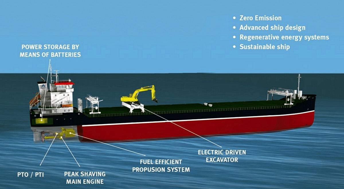 Dodatkowym elementem jest hybrydowy system PTO/PTI (Power Take-Off/Power Take-In – odbiór/doprowadzenie), pozwalający na elastyczne zarządzanie mocą - zarówno przez odzysk energii z wału napędowego, jak i wspomaganie go napędem elektrycznym. Ponadto jednostka będzie posiadała w pełni elektryczny sprzęt do przeładunku, co pozwoli na samodzielny załadunek i rozładunek w portach, jednocześnie eliminując emisję spalin w miejscach z dostępem do zasilania lądowego.