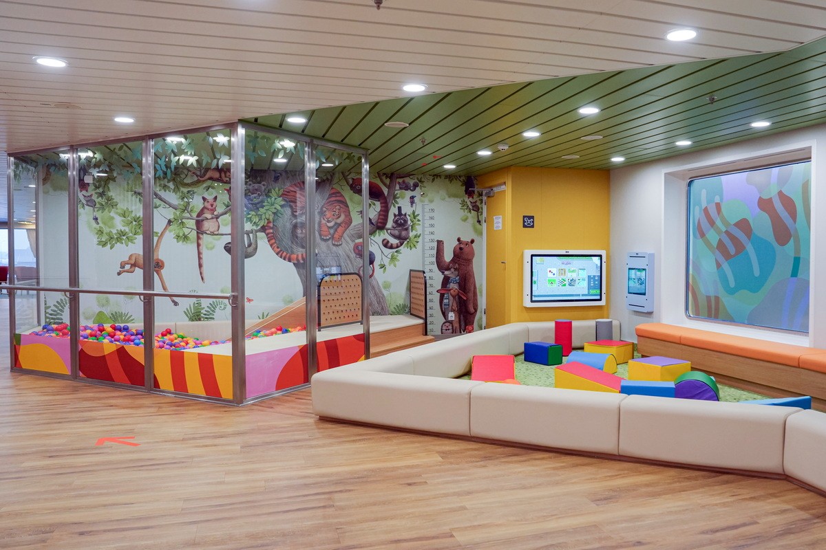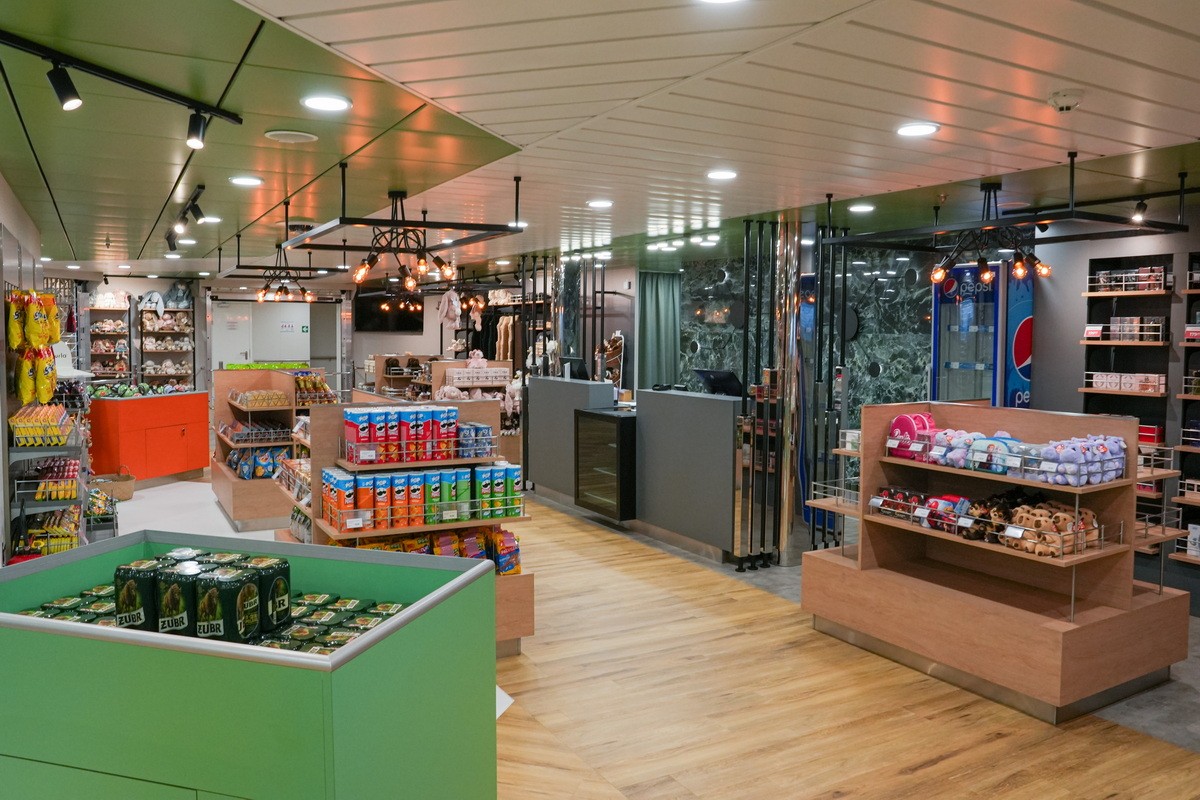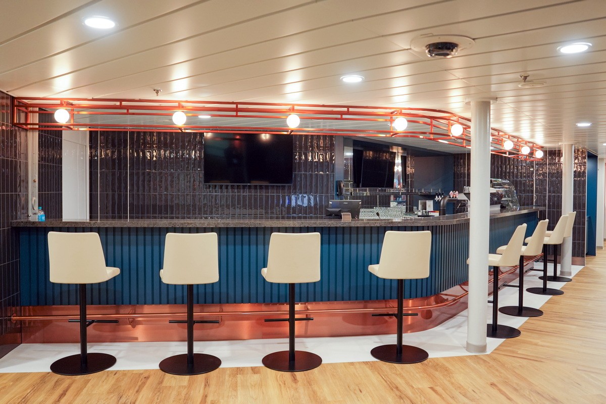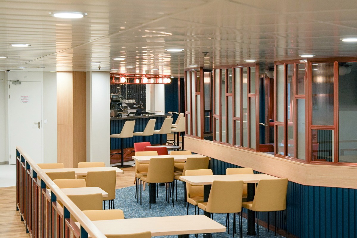 Na promie przewidziano liczne przestrzenie wypoczynkowe – kafeterię, bary oraz strefy rodzinne, w których można zjeść posiłek, spotkać się z innymi pasażerami lub spędzić czas z dziećmi. Całość wspiera także nowoczesna inżynieria bezpieczeństwa, obejmująca systemy przeciwpożarowe i kontrolne.