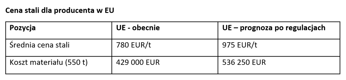 - Koszt stali dla producenta w UE: 536 250 EUR