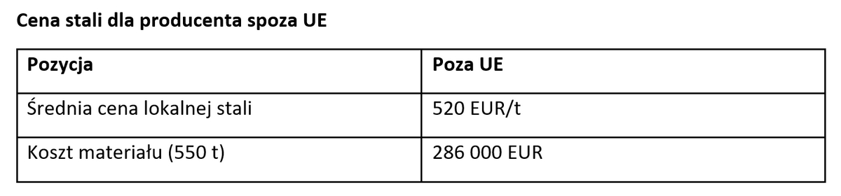 - Koszt stali dla producenta spoza UE: 286 000 EUR