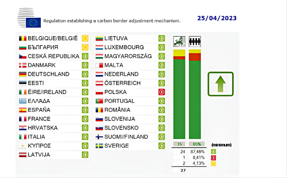 25 kwietnia 2023 w trakcie głosowania Polska jako jedyny kraj głosował przeciw, Belgia i Bułgaria wstrzymały się od głosu, pozostałe kraje poparły CBAM.