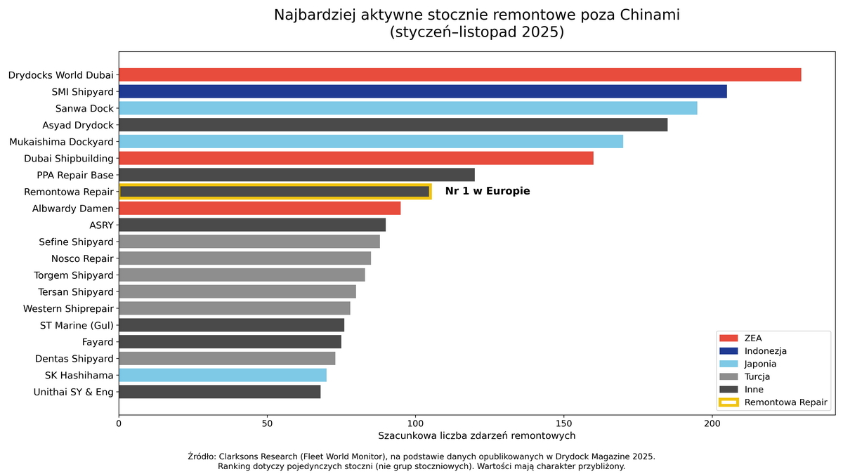 Dane brytyjskiej wywiadowni nie przynoszą niespodzianek. Globalny rynek usług remontowych pozostaje silnie skoncentrowany w Azji. W badanym okresie Chiny odpowiadały za 47 proc. wszystkich remontów statków na świecie, utrzymując pozycję lidera. Poza Chinami istotną rolę odgrywają również Turcja (8 proc.), Indonezja i Japonia (po 4 proc.), Korea Południowa (2 proc.) oraz ośrodki Azji Południowo-Wschodniej, a także stocznie Bliskiego Wschodu, zwłaszcza w Zjednoczonych Emiratach Arabskich (ZEA - 3 proc.) i Bahrajnie.