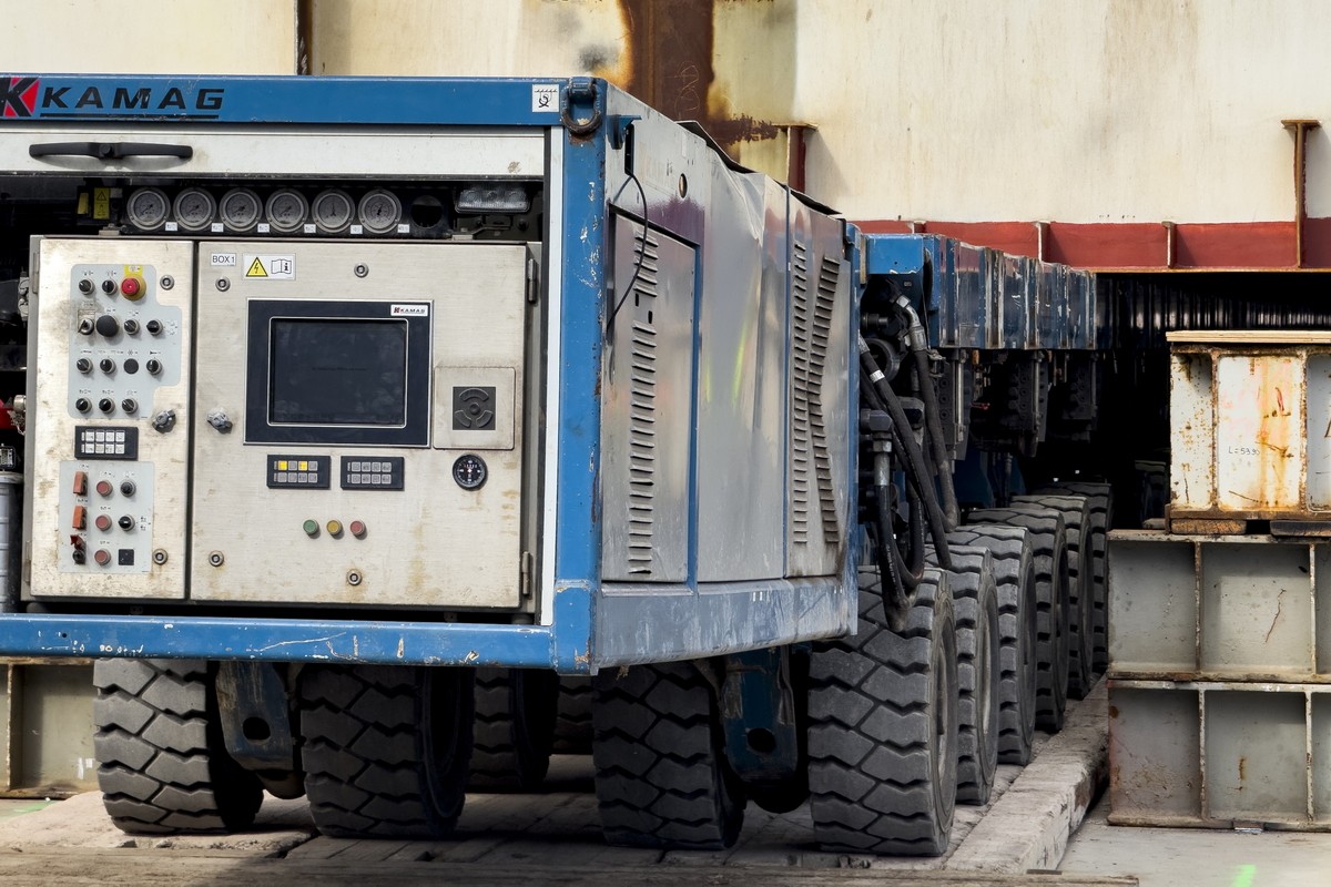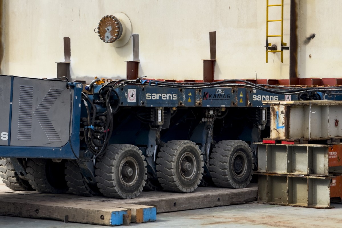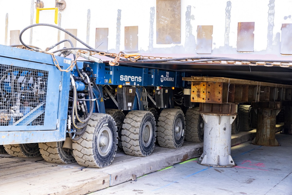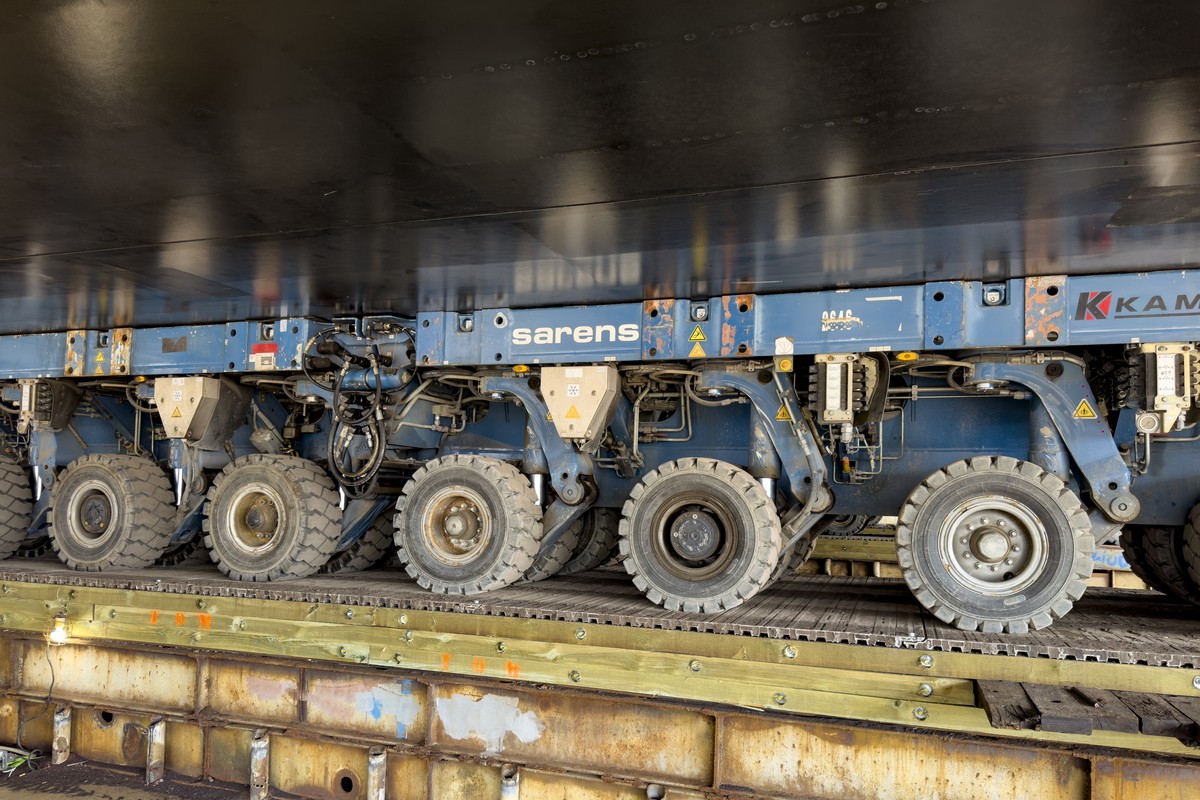 Do przemieszczenia modułu wykorzystano samobieżne transportery modułowe (SPMT). Wieloosiowe zestawy pozwalają na kontrolowane i precyzyjne manewrowanie wielotonowym ładunkiem na nabrzeżu.
